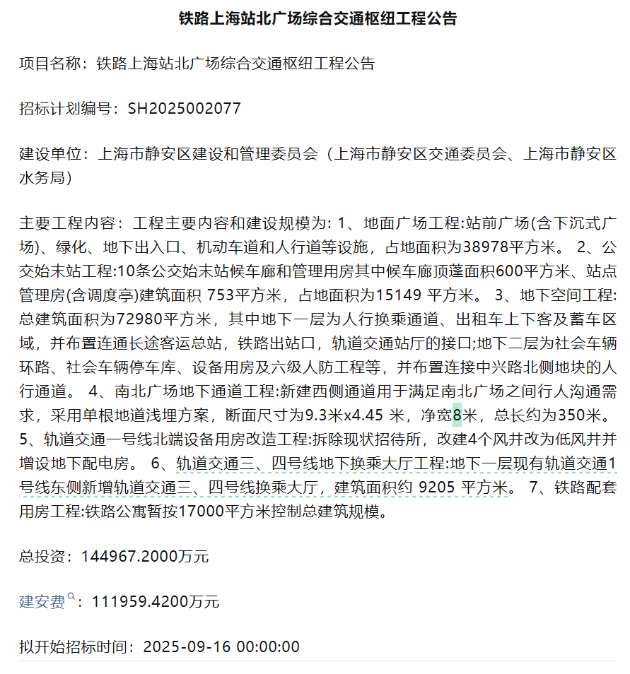 小侬从最新的招标预告上看到,这次,铁路上海站北广场综合交通枢纽工程,涵盖七大建设内容,总投资超14亿元。